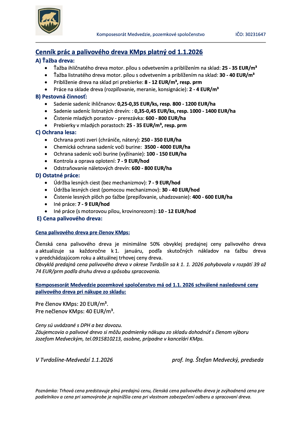 Smernica - Cenník a meranie palivového dreva KMPS 2026